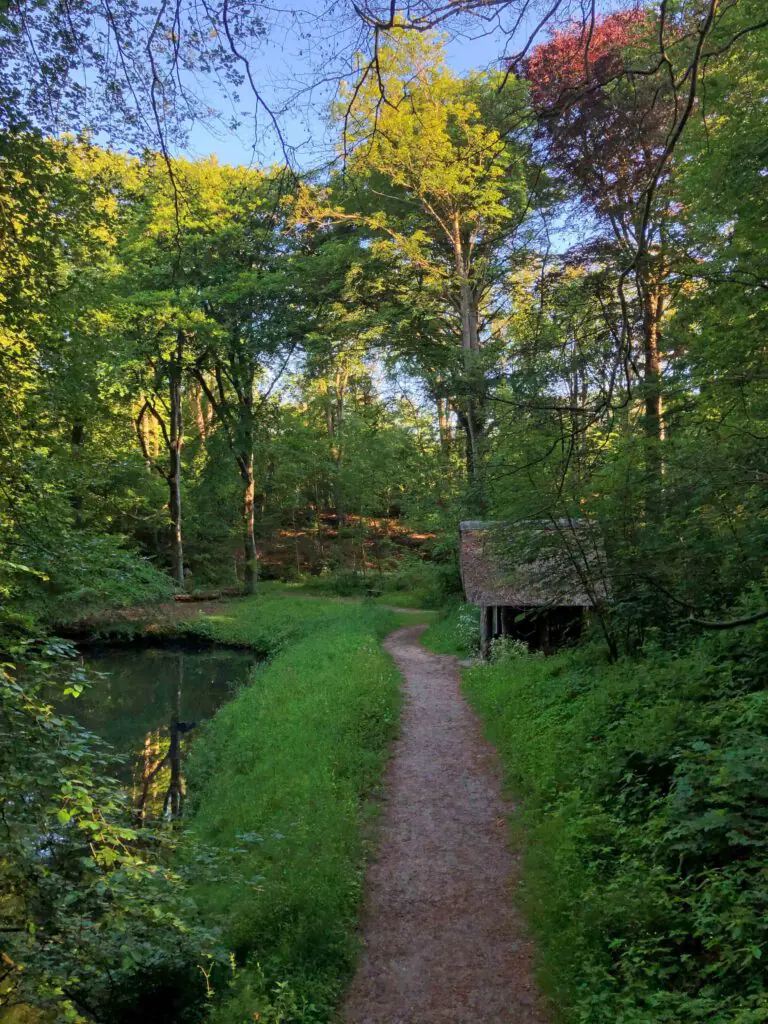 In het weiland spotten we twee ooievaars en een grote groep ganzen met kleintjes (zo schattig). We maken wat foto’s en lopen verder langs een grote omgevallen boom. De route gaat rechts af en gaat weer terug het bos in. We wandelen een stukje langs het water en komen mooie bomen tegen waarvan de wortels hun eigen weg vinden over het pad en de helling. Links is een uitzichtpunt en die laten we natuurlijk niet links liggen. We bekijken het uitzichtpunt en lopen het water over via een mooie houten brug. De route loopt verder door het bos en na de boshut moet je rechts aanhouden.